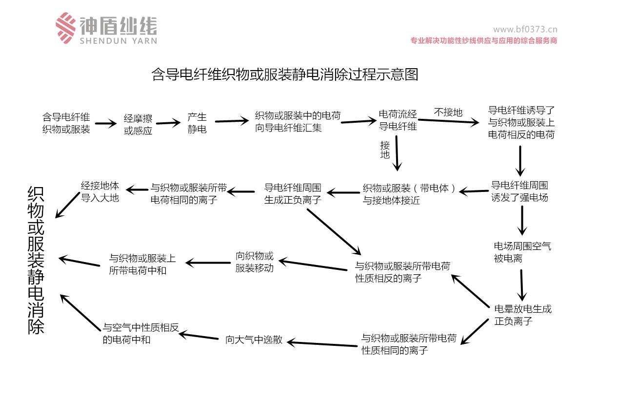 接地的導(dǎo)電纖維消除織物或服裝上的靜電過(guò)程大致為: