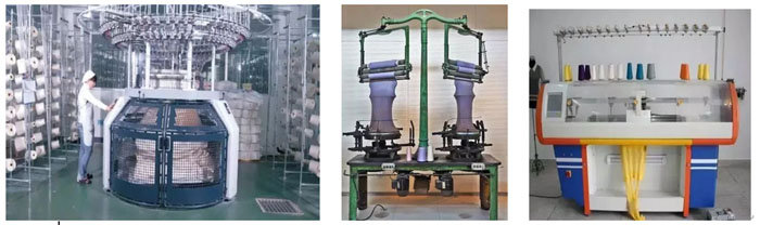 圓緯機(如臺車、棉毛機、單面大圓機及提花大圓機)及襪機、橫機、雙反面機等。