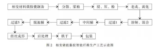 相變儲能黏膠智能纖維采用微膠囊技術,使纖維具有雙向溫度調節和適應能力,在溫度波動震蕩的環境中可反復循環使用,為受保護空間提供舒適的內環境[23]。相變儲能黏膠纖維通過控制乳化劑的條件、含量和種類,得到平均直徑約為0.8μm的相變材料微膠囊,為了減少微膠囊的流失紡絲原液需保持高堿纖比,紡絲工藝采用低酸凝固浴緩和成型技術,并通過低溫、高效的后處理來保證纖維中微膠囊含量和纖維強度,如市面上1.67dtex×38mm的相變儲能黏膠短纖維。圖2為相變儲能黏膠智能纖維的制備工藝流程示意圖。