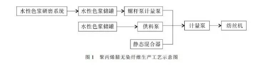 聚丙烯腈無染纖維通過在紡絲前將色彩物質添加到紡絲高聚物中,實現了纖維的在線染色,從而減少了后續染色污水的排放,如市面上有的1.67dtex×38mm,2.22dtex×51mm,2.78dtex和3.33dtex規格的原液超黑腈綸短纖維。聚丙烯腈無染纖維可單紡也可與腈綸、棉、黏膠等纖維進行混紡,產品具有高摩擦色牢度、耐洗滌色牢度、耐日曬色牢度等優良性能,在后整理過程中為了防止織物的脆化整理定型溫度一般不超過170℃。聚丙烯腈無染纖維大量用于開發戶外用品方面,如帳篷、車用頂棚、遮陽傘等,在服飾方面無染腈綸與常規纖維混紡可用于織造麻滅紗、雪尼爾紗等。圖1為聚丙烯腈無染纖維工藝流程的示意圖。