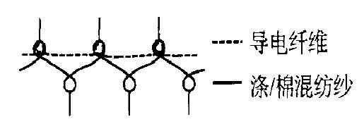若基礎(chǔ)組織采用1+1羅紋組織,導(dǎo)電纖維用添紗方式織入,那么必須指出的是,導(dǎo)電絲僅在上針進(jìn)行添紗編織,下針不能墊到導(dǎo)電絲,而滌棉混紡紗即基礎(chǔ)組織紗線在上下針都?jí)|紗成圈。