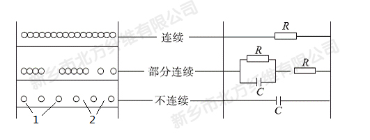 b:一部分導電顆粒不完全連續接觸,其中不相互接觸的導電顆粒之間由于隧道效應形成電流通路,相當于一個電阻與一個電容并聯后再與一個電阻串聯的情況。
