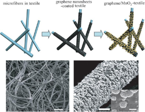 (2)開發電化學性能優良的棉織物。以棉織物為基材、通過浸潤-干燥法和化學沉淀法,將GO和二氧化錳接枝于棉織物表面,制成復合棉織物,再經碳化處理,改善電化學性能。