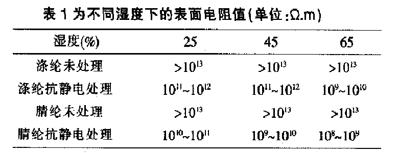 在化纖加工過程中,如滌綸、丙綸、睛綸和錦綸等,采用上抗靜電油劑的辦法來消除靜電的危害。其作用機理是提高織物回潮率、降低絕緣性,加速靜電泄漏。因此在干燥環境中、或經多次洗滌后,加工效果不耐久、或不顯著,通常在普通服用織物上應用較多。非耐久性抗靜電處理的織物,它的抗靜電性能受環境溫濕度的影響較大。