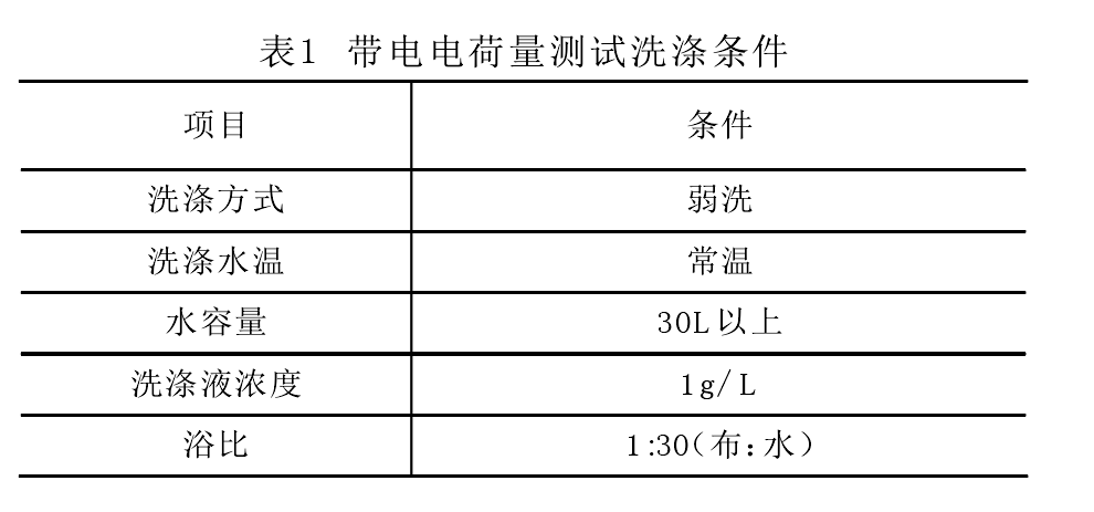 在對防靜電毛針織服進行帶電電荷量測試前應按照規定的方法進行洗滌,洗滌時間為6.5h,與GB12014-2009《防靜電服》標準中的洗滌方法相同,用中性洗滌液連續弱檔洗滌、水溫為常溫。其洗滌條件和程序,見表1、表2.