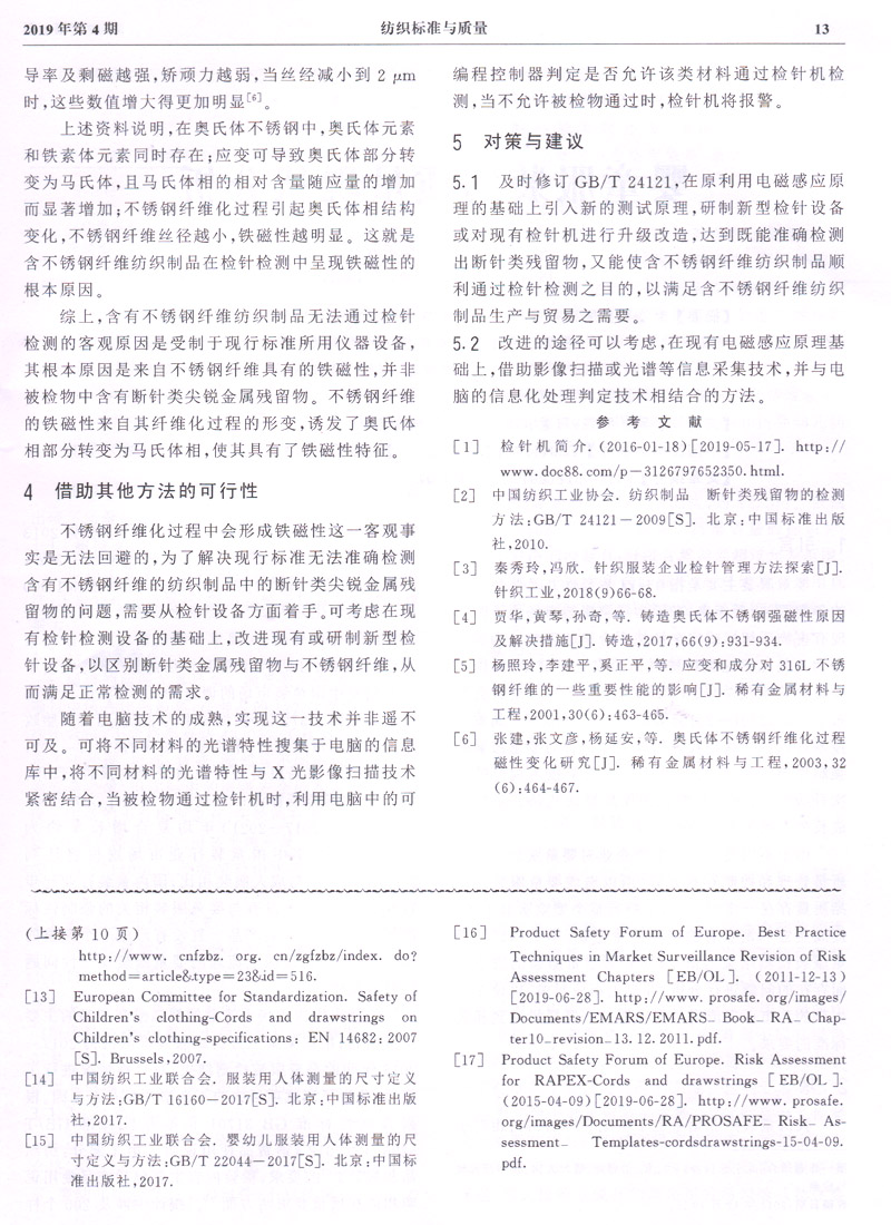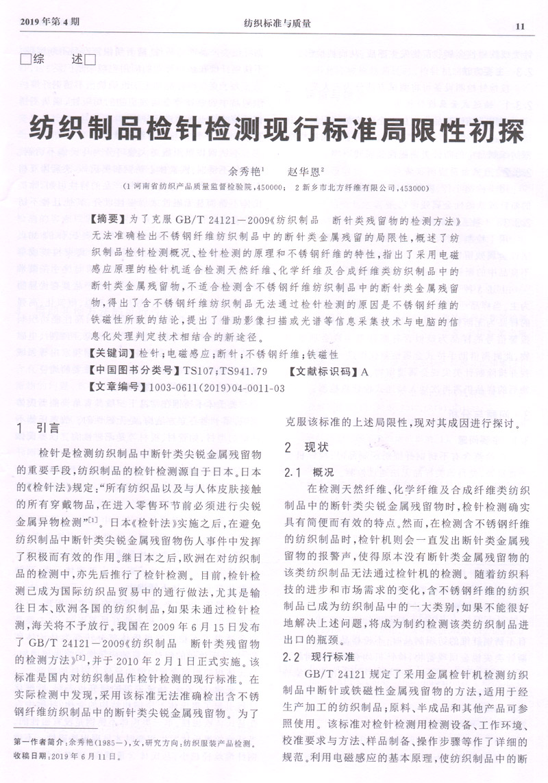 2019年8月25日出版的《紡織標準與質量》(A類學術期刊)2019年第四期發表的“紡織制品檢針檢測現行標準局限性初探”一文,從紡織制品檢針檢測概況、檢針檢測的原理和不銹鋼纖維的特性諸方面分析、較為全面的探討了其原因。