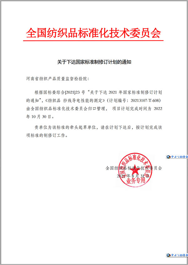 新鄉(xiāng)市北方纖維有限公司、河南省紡織產(chǎn)品質(zhì)量監(jiān)督檢驗院、華北水利水電大學(xué)合作的″紡織品紗線導(dǎo)電性能檢測方法"項目列入國家標準制修訂計劃。