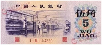 ▲1974發行的《三版伍角(刀)》的正面主景是一個紡織車間,幾名紡織女工正在車床前工作。