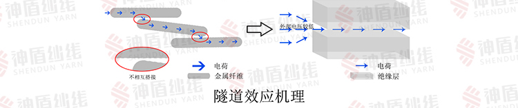 電紗線中,金屬纖維之間不能相互搭接,但其間距較小,無法形成鏈狀導電通道的情況下,外加電壓較低時,隧道效應導電機理起主導作用;