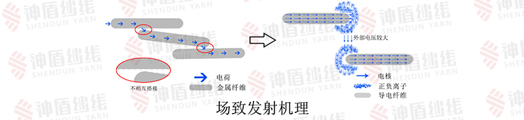 電紗線中,金屬纖維之間不能相互搭接,但其間距較小,無法形成鏈狀導電通道的情況下,外加電壓較高時,場致發射導電機理起主導作用。